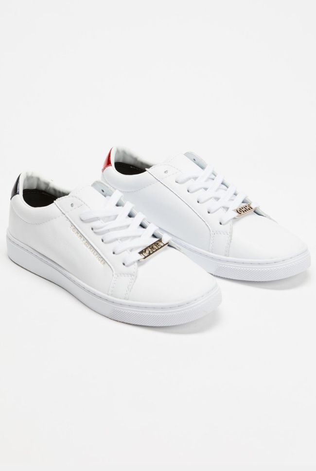 Equal parts stylish and classic, these trainers from Tommy Hilfiger will add the perfect finishing touch to your ‘fit. The smooth white leather upper is complemented with a coloured heel tab and gold metal branding.