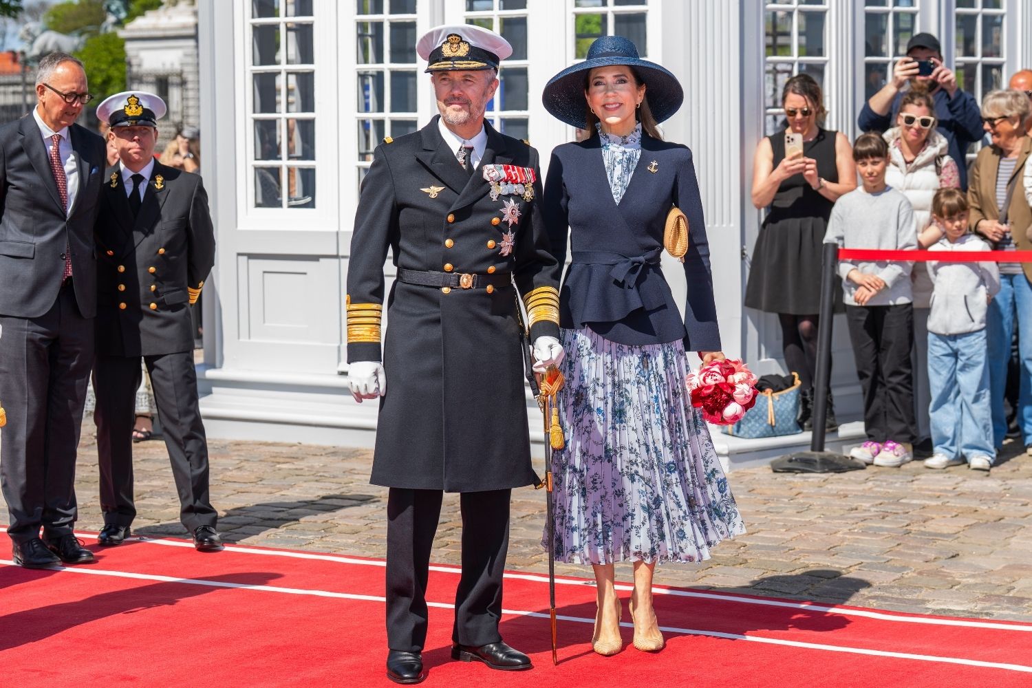 With her doting husband by her side and a beautiful floral bouquet in her hands, Mary was all smiles as she boarded The Royal Ship Dannebrog to sail to Sweden for a state visit on May 2nd.